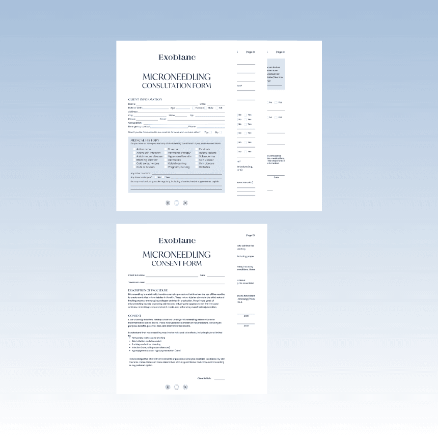 The Exoblanc Microneedling Forms combine detailed pre-treatment consultation questions with informed consent documentation, helping practitioners gather key client information while presenting a premium clinic experience.
