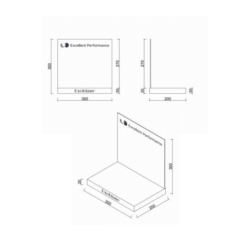 Create a clean, elevated retail presence with the Exoblanc Acrylic Product Stand — a premium branded display designed to showcase your Exoblanc skincare collection in clinic, salon and retail spaces. Crafted from durable acrylic with a sleek minimalist finish, this modern stand helps organise products while drawing attention to your hero lines. The raised back panel offers clear brand visibility, while the front display shelf is ideal for serums, creams, masks, toners and promotional launches. Designed to complement the Exoblanc aesthetic, it brings a polished, professional look to reception desks, consultation rooms and treatment areas. Perfect for clinics wanting to enhance visual merchandising and encourage retail sales. The Exoblanc Acrylic Product Stand is designed to maximise visibility and create a more professional retail display. Use the 300mm wide front shelf to position key products, launches or bestsellers, while the 300mm high branded backboard creates strong brand presence. The 200mm depth provides enough display space without taking up excessive counter room — ideal for clinic desks, shelves and reception areas. 300mm (W) x 200mm (D) x 300mm (H) Display 3–6 hero products neatly spaced for the cleanest premium look.Stand Size: